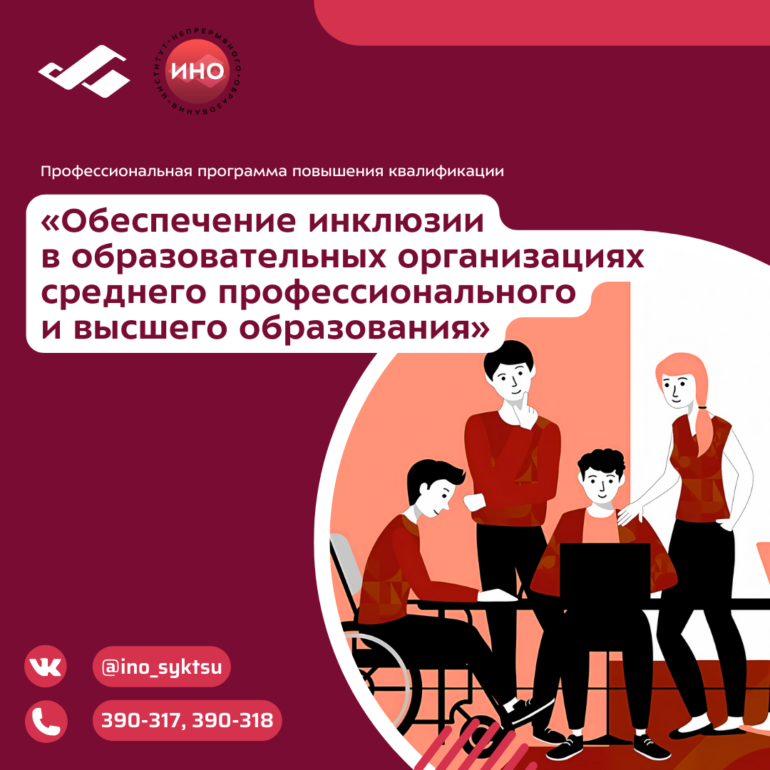 В Институте непрерывного образования СГУ им. Питирима Сорокина открыт набор на новую профессиональную программу повышения квалификации «Обеспечение инклюзии в образовательных организациях среднего профессионального и высшего образования». Обучение будет реализовано с применением дистанционных технологий с 14 по 21 октября на бесплатной основе. Количество мест ограничено!