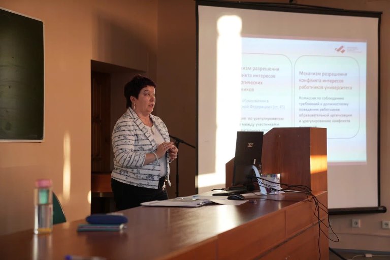 Проректор Лариса Казакова рассказала о таком явлении, как «конфликт интересов». Сам конфликт интересов не является преступлением, однако может его повлечь за собой. Спикер отметила, что в университете студенты всегда смогут получить консультацию по той или иной ситуации, поэтому важно сразу же обратиться к руководству вуза.