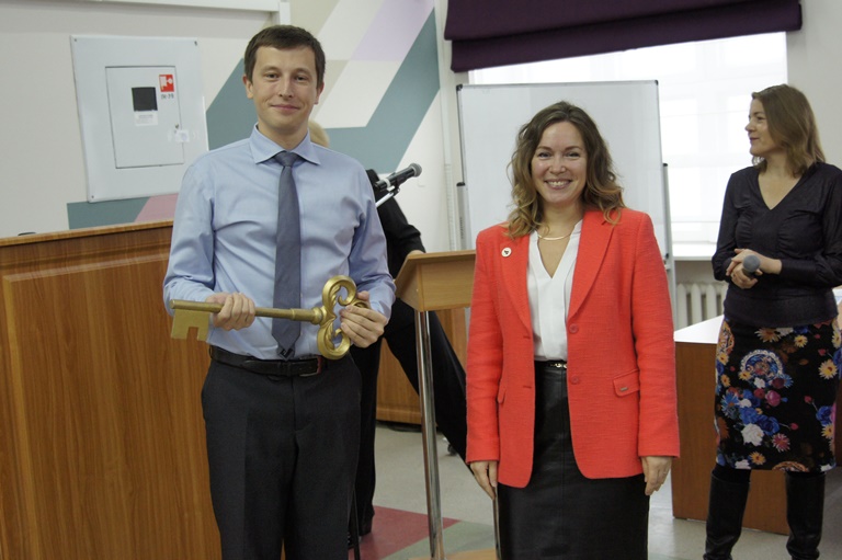 Староста группы выпускников Президентской программы 2024 года, заместитель генерального директора ООО «Центр развития Бендфорт», Светлана Сорвачева вручила Ключ знаний представителю новой группы - начальнику производственно-технологического центра Управления связи филиала ООО «Газпром трансгаз Ухта» Алексею Миллеру.