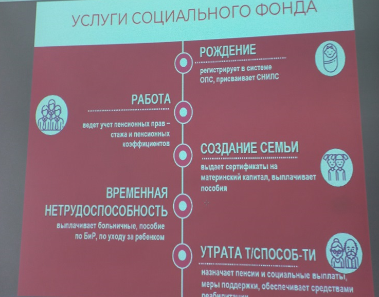 Далее студентам были представлены функции и объединенные полномочия Фонда пенсионного и социального страхования Российской Федерации, наглядно показана формула исчисления страховой пенсии, разъяснен алгоритм страхового стажа и пр.