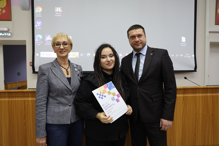 Никита Марковченков вручил благодарности активным студентам и сотрудникам медиацентра «Verbum». Ребята принимали участие в организации Республиканского образовательного форума «Молодежь Коми–2024». Высокий уровень организации мероприятия отмечен на федеральном уровне.