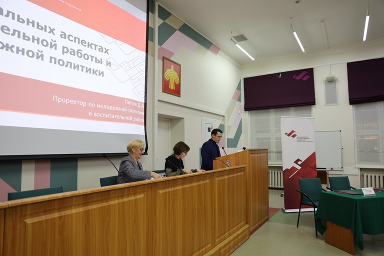 После окончания торжественной части участники заседания перешли к основной повестке. С докладом «Об актуальных аспектах воспитательной работы и молодежной политики» выступил проректор по молодежной политике и воспитательной работе Дмитрий Попов.
