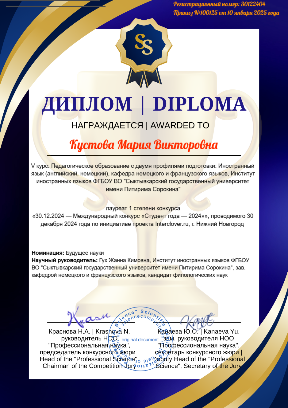 Студентка группы 1051п-АНо Мария Кустова приняла участие в международном конкурсе портфолио, проводимом проектом Interclover.ru (г. Нижний Новгород). Мария участвовала в номинации «Будущее науки». В своём портфолио студентка представила свои научные работы как по лингвистике, так и по методике, а также рассказала о деятельности, связанной с популяризацией немецкого языка и культуры. Наставником Марии является заведующий кафедой немецкого и французского языков Жанна Кимовна Гух. Наставническая деятельность Жанны Кимовны была отмечена Благодарственным письмом.