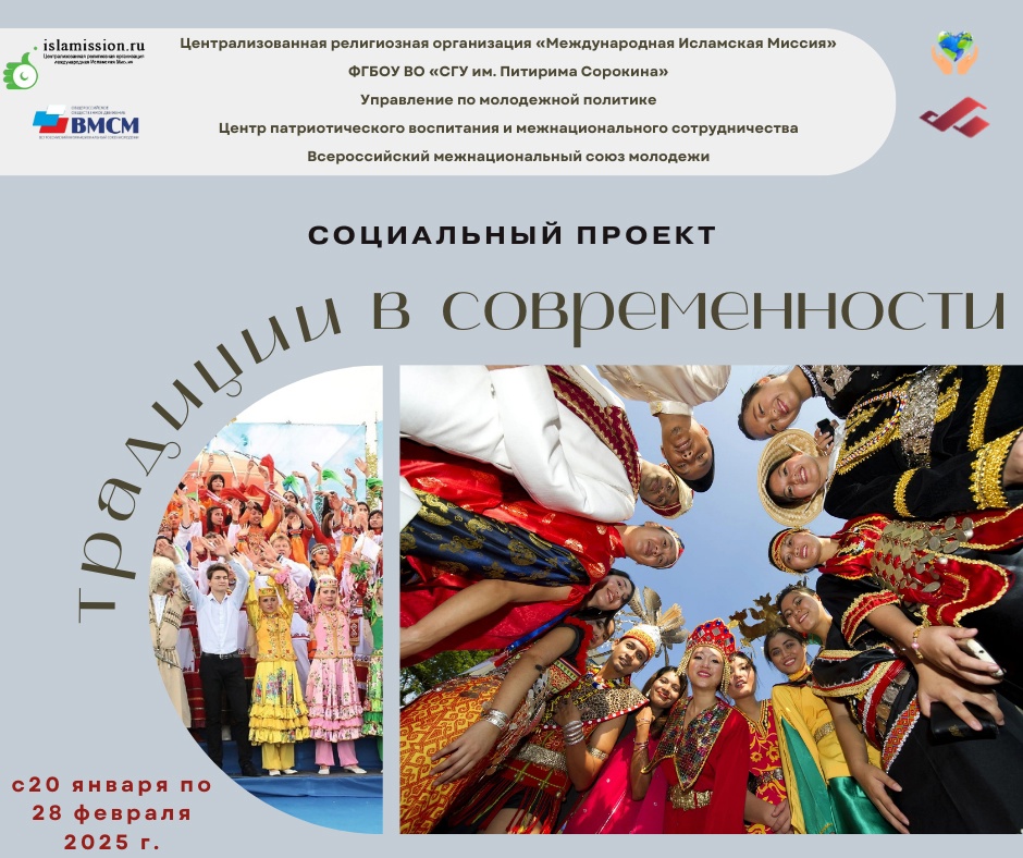 20 января в СГУ им. Питирима Сорокина стартовал проект «Традиции в современности». Площадка включит в себя цикл мероприятий, направленных на укрепление связей между представителями мусульманского и российского обществ, обогащение культурного ландшафта и обеспечение устойчивого диалога между культурами. Организатором выступит Центр патриотического воспитания и межнационального сотрудничества Управления по молодежной политике совместно с Централизованной религиозной организацией «Международная Исламская Миссия».