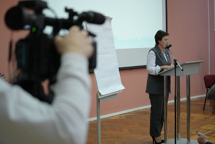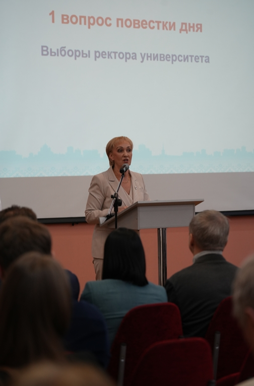Далее к трибуне вышла Ольга Сотникова, которая уже восемь лет руководит вузом. Она представила краткий отчет о своей работе.