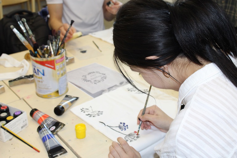 Вторая группа посетила мастер-класс по верховой набойке на ткани. Техника ручной набойки – один из древнейших способов украшения текстиля. Суть такого метода состоит в том, что на деревянную форму с вырезанным орнаментом наносится краска, затем форма плотно прижимается к полотну и мастер, постукивая ее киянкой, набивает рисунок на ткань.