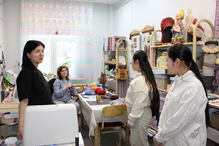 В начале визита для иностранных студентов организовали экскурсию по Дому народных ремесел. Ребят провели по мастерским, работающим по художественной обработке дерева, художественной обработке бересты, ткачеству, кружевоплетению, керамике, современному искусству (батик, бисероплетение) вязанию и художественной обработке текстиля.
