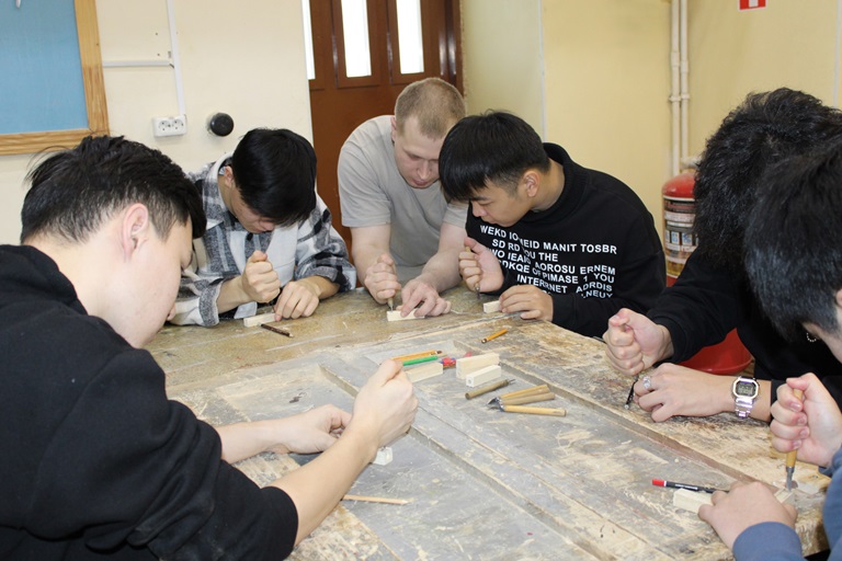 Группа мальчиков отправилась в мастерскую по художественной обработке дерева на мастер-класс «Резьба по дереву, деревянная игрушка». Каждый студент под руководством опытного мастера изготовил деревянную игрушку «Свистулька»