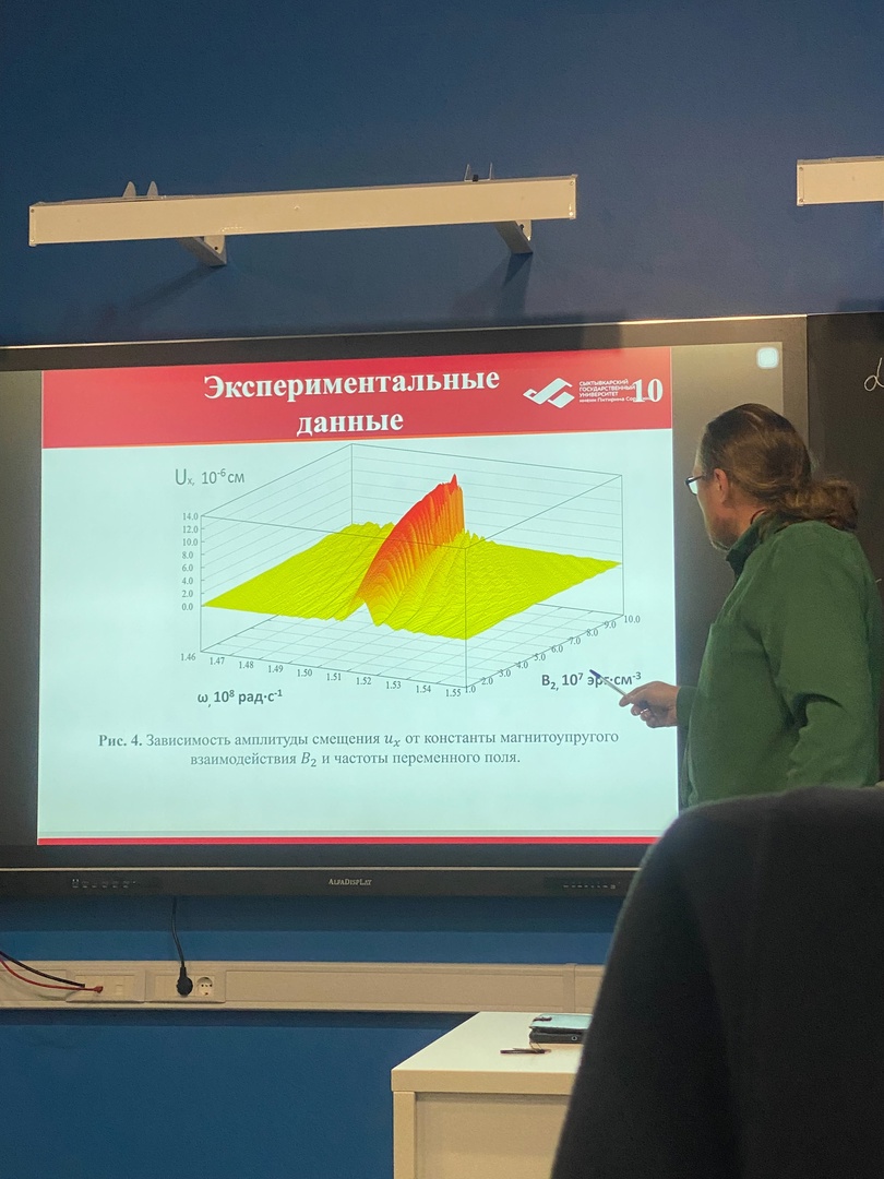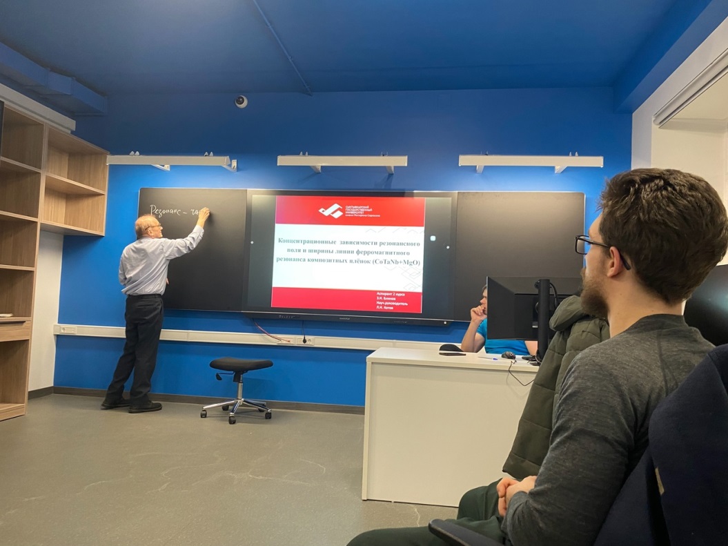 Наибольший интерес вызвали доклады: Абрамовского И.Е. «Нелинейная динамика магнитных колебаний и ориентационные переходы в трехслойных анизотропных пленках», Блинова З.Н. «Концентрационные зависимости резонансного поля и ширины линии ферромагнитного резонанса композитных плёнок (CoTaNb+MgO)», Гаврилюк С.И. «Исследование функциональной связи проводимости и параметров ферромагнитного резонанса с концентрацией и толщиной композитных металл-диэлектрических плёнок», Майбурова М.В.: «Исследование магнитоупругой динамики в ферримагнитных кристаллах, включающих область магнитной переориентации».