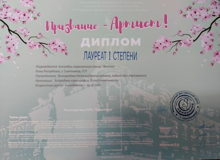 Коллектив СГУ им. Питирима Сорокина «Фаэтон» стал лауреатом фестиваля «Призвание - Артист!»