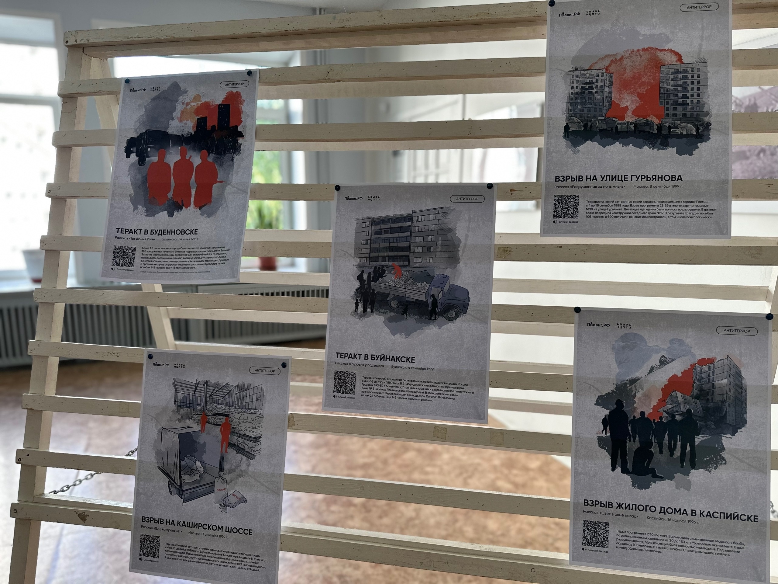 Экспозиция представляет собой мультимедийный проект, демонстрирующий хронологию 15 наиболее значительных терактов в новейшей истории России. Посредством QR-кодов посетители получают доступ к расширенному контенту: архивным материалам, биографическим справкам и документам. Проект создает условия для глубокого осмысления трагических событий и сохранения исторической памяти.