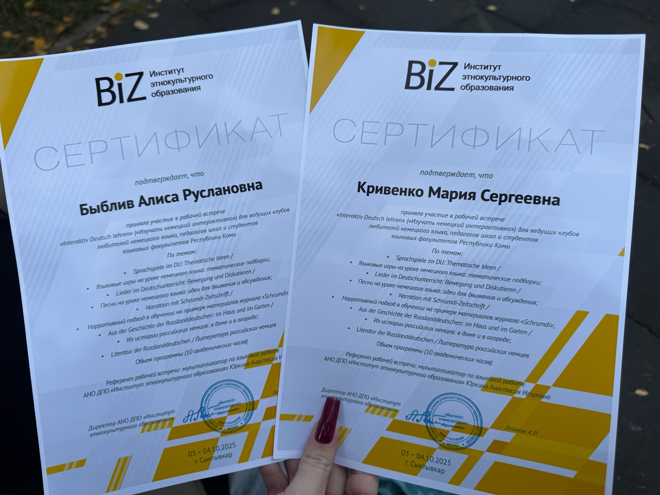Алиса Быблив: «На семинаре мы узнали много новых и креативных приемов и игр, которые можно будет использовать на практике и в дальнейшей профессиональной деятельности. Семинар отличался от других мероприятий, на которых я была: я думала, что это будет лекция, на которой мы будем слушать теоретический материал, а на самом деле было очень много творческой работы, мы сами принимали участие в играх, даже пели и танцевали. Также очень интересно и полезно было то, что семинар проходил в основном на немецком языке, почти весь материал был мне понятен, а если и возникали какие-то трудности, то мне помогали. Особенно понравилось, что можно было попрактиковать немецкий язык. Семинар был организован на высшем уровне, я очень рада и благодарна, что у меня появилась возможность поучаствовать в таком мероприятии».