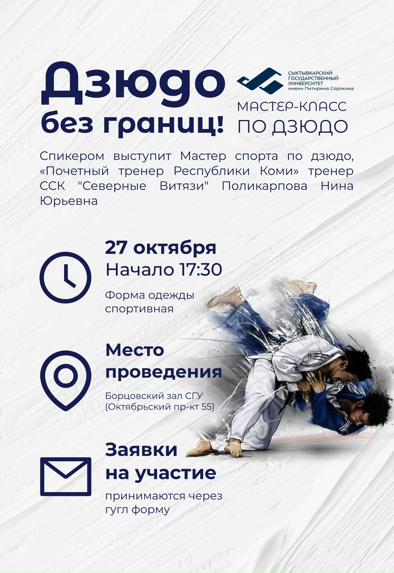 Приглашаем студентов и преподавателей университета принять участие в мастер-классе по дзюдо, который пройдет 27 октября в 17:30 в борцовском зале СГУ им. Питирима Сорокина по адресу Октябрьский проспект, 55. Мастер-класс проведет тренер, мастер спорта по дзюдо, почетный тренер Республики Коми, тренер ССК «Северные Витязи» Нина Поликарпова.