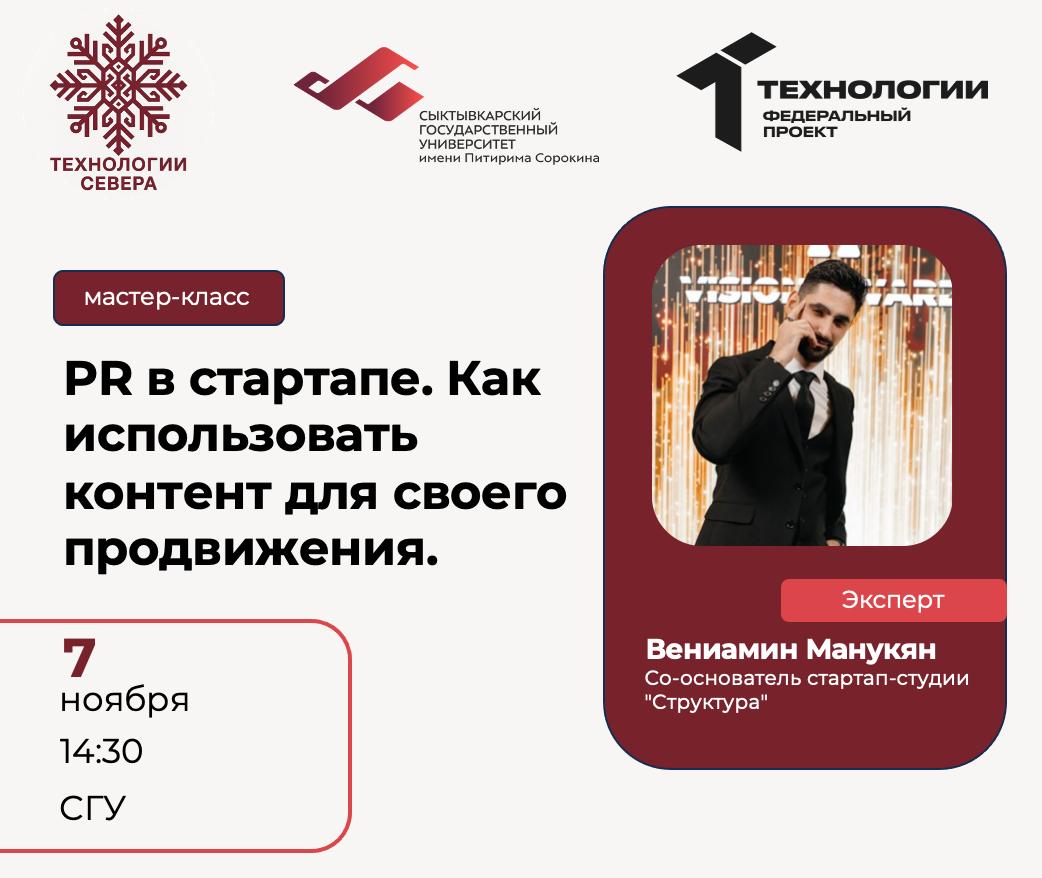 7 ноября в 14.30 в рамках акселерационной программы «Технологии Севера» состоится Мастер-класс: "PR в стартапе. Как использовать контент для своего продвижения. Формирование бренда стартапа. От стратегии к тактике".