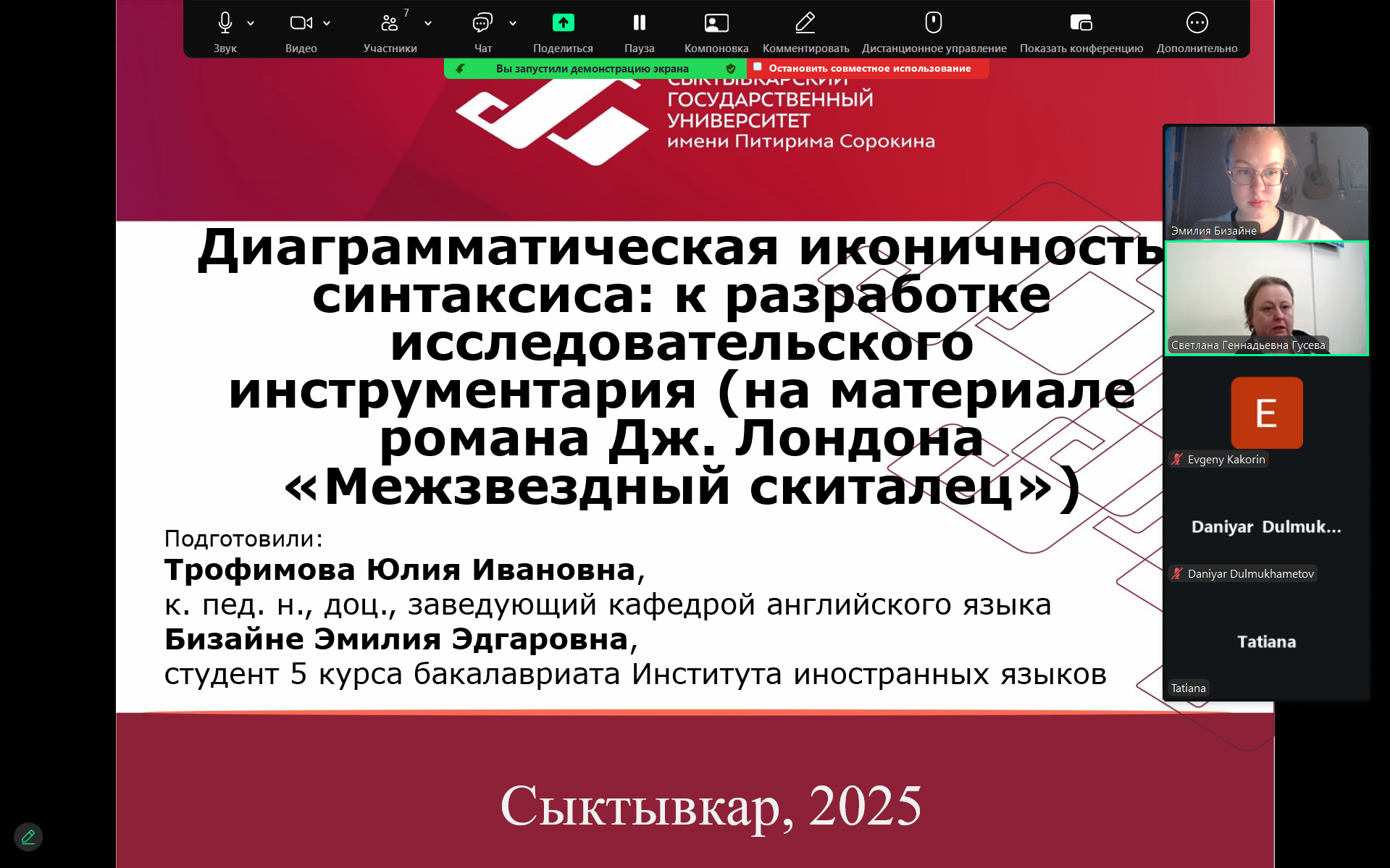В секции «Молодые исследователи» свой научный поиск представила студентка той же группы Эмилия Бизайне темой «Диаграмматическая иконичность синтаксиса: к вопросу о классификации и средствах выражения».