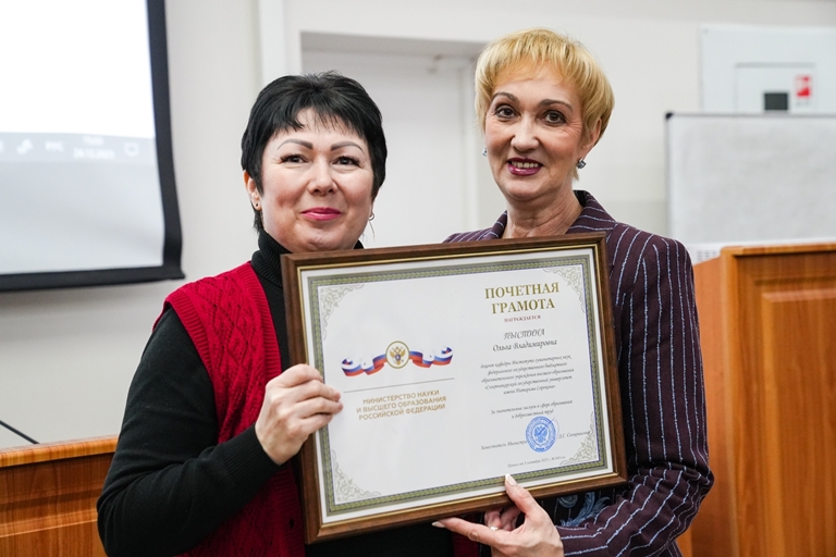 Ректор Ольга Сотникова вручила почетные грамоты Минобрнауки России за значительные заслуги в сфере образования и добросовестный труд директору Института культуры и искусства Ольге Максимовой, доценту кафедры Института гуманитарных наук Ольге Пыстиной, доценту кафедры Института иностранных языков Юлии Сухоруковой.