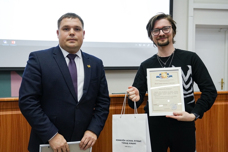 Гостем ученого совета стал директор Республиканского молодежного центра Дмитрий Алексеев. Он вручил благодарственные письма и памятные подарки сотрудникам медиацентра Verbum: Олегу Уразову, Анастасии Поздеевой, Елизавете Каракчиевой, а также начальнику Информационно-аналитического отдела Людмиле Губарь. Дмитрий Алексеев отметил большой вклад наших специалистов в реализации социально значимых проектов на территории Республики Коми.