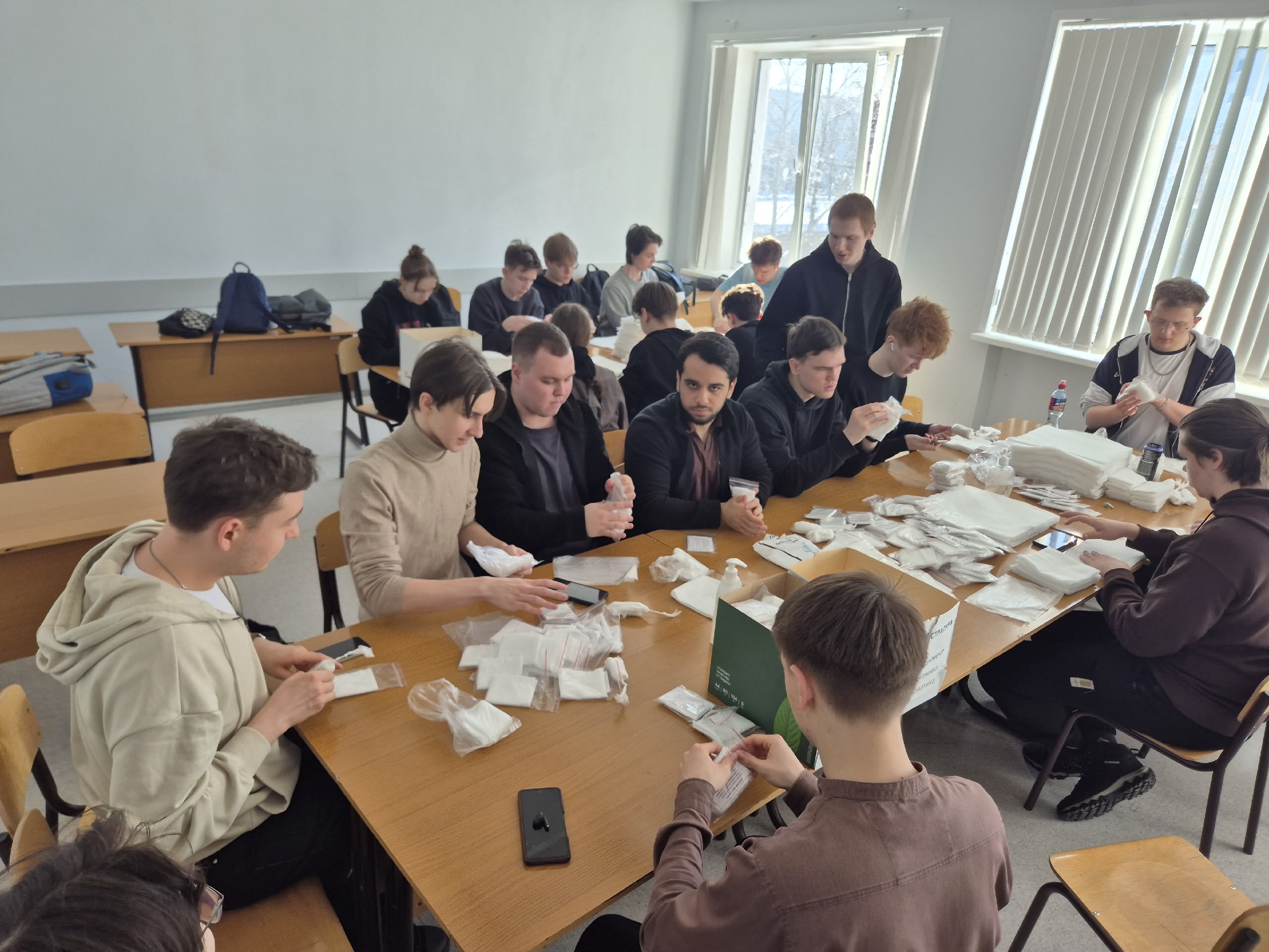 Инициаторами акции выступили преподаватели института - Людмила Николаевна Губарь, Светлана Владимировна Мясникова и Марина Стефановна Туркина. На призыв о помощи откликнулись не только сотрудники, но и студенты разных курсов. В аудитории царила атмосфера настоящего волонтерского штаба: будущие IT-специалисты и математики осваивали новую для себя технологию — резку материалов, вкладывание специальных пропиток и упаковку готовых наборов.