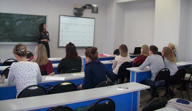 Преподаватель международного образовательного центра «Education First» из Санкт-Петербурга Лариса Полякова рассказала слушателям о формате и структуре международного профессионального экзамена и особенностях подготовки к нему. Сертификат теста TKT выдает организация Cambridge English Language Assessment, являющаяся подразделением University of Cambridge. Этот международный сертификат высоко ценится и является показателем высокого качества.