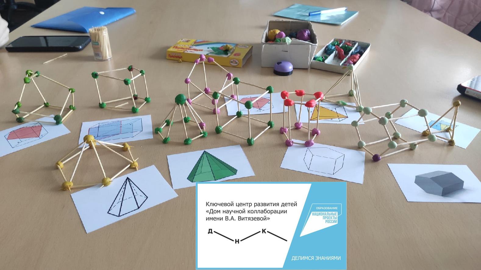 Школьники изучают геометрические фигуры и тела, их особенности и классификацию, строят развертки геометрических тел, изучают проецирование объектов на плоскость и решают задачи для развития пространственного мышления. На практическом занятии они строят из зубочисток и пластилина свои пространственные объекты, чтобы определить, сколько у геометрического тела вершин и ребер, а также выполняют свои первые чертежи геометрических тел и различных деталей.