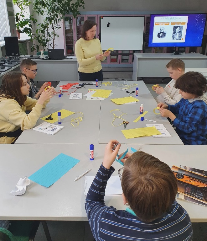 - 5 «В» класс побывал на занятии в ДНК им. Витязевой. Во время мероприятия ребята получили бурю положительных эмоций. Изначально они думали, что будут решать примеры и слушать правила, как на уроках, оказалось, что все намного интереснее и увлекательнее. Ребята познакомились с объемными фигурами, которые сами выполнили из зубочисток и пластилина, узнали про известного немецкого математика Августа Фердинанда Мебиуса и его знаменитую ленту Мебиуса. С помощью бумаги, клея и ножниц выполнили свою ленту. К сожалению, не все ребята успели побывать на трех площадках, так как время ограничено, это их немного расстроило, - поделилась впечатлениями учитель школы №35 Елена Липина.