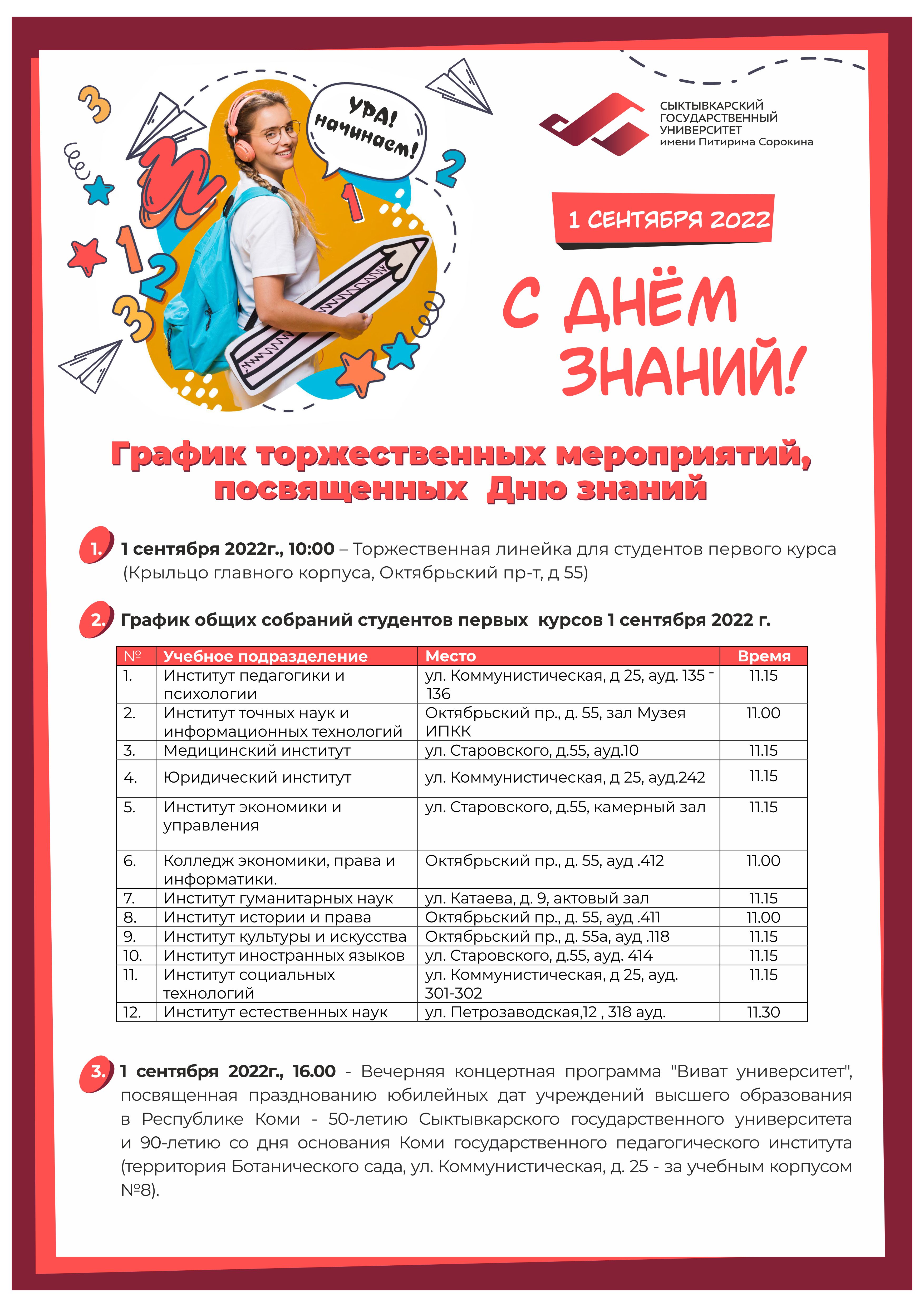 Линейка для всех первокурсников состоится 1 сентября в 10:00 на крыльце учебного корпуса №1 СГУ им. Питирима Сорокина по адресу: г. Сыктывкар, Октябрьский пр., д.55.