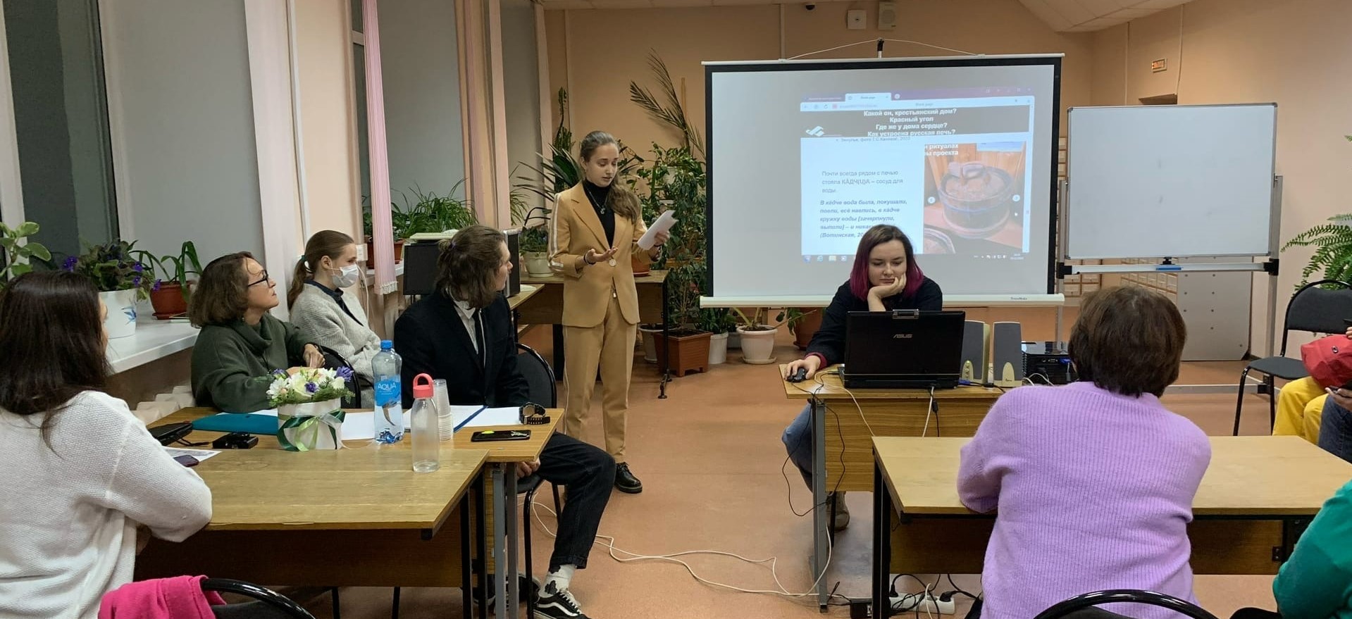 Первой лонгрид «Крестьянский дом. Красный угол. Печь» представила студентка 3-го курса направления «Филология» Ирина Канева. Она заострила внимание на том, что изучение традиционной культуры в аудитории не сравнится с естественным погружением в нее в полевых условиях.
