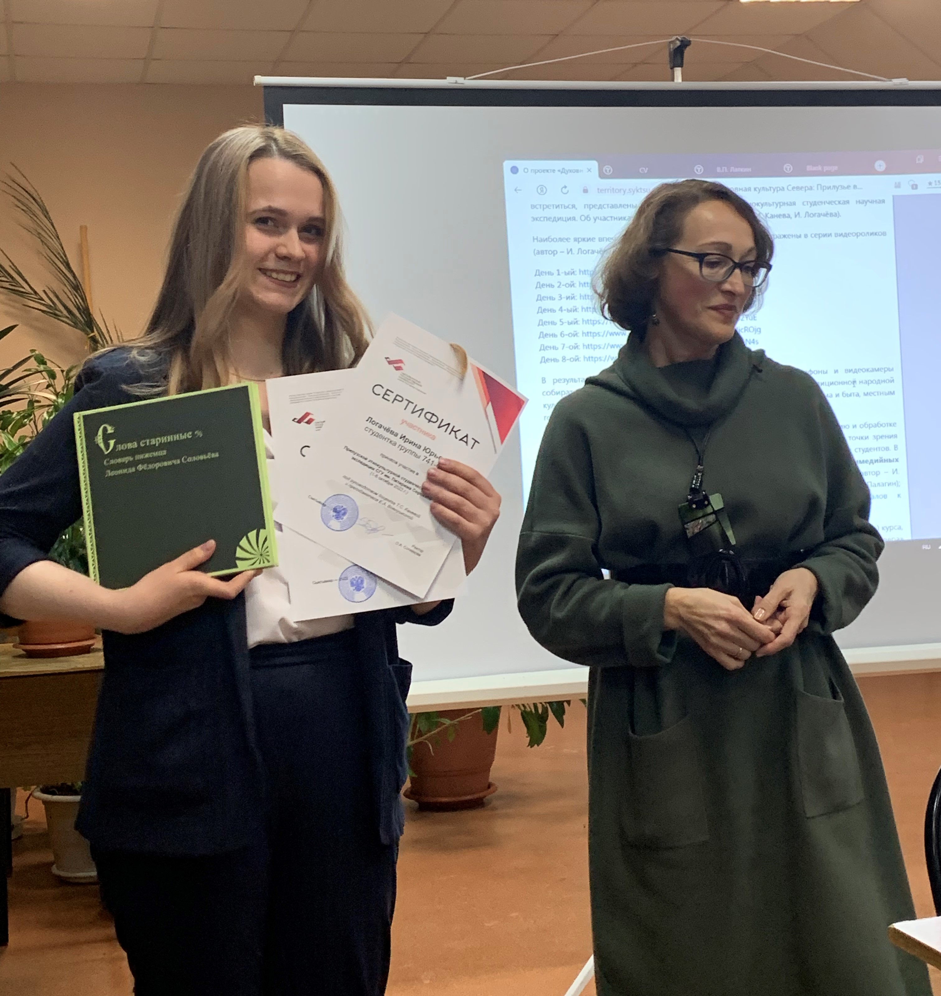 Руководители проекта поблагодарили Ирину Логачёву – студентку 4-го курса направления «Филология» – автора хроники экспедиции, а также еще двух участниц экспедиции Варвару Меньшенину, студентку-филолога 3-го курса, и Алину Михалюк, студентку 3-го курса направления «Филология».