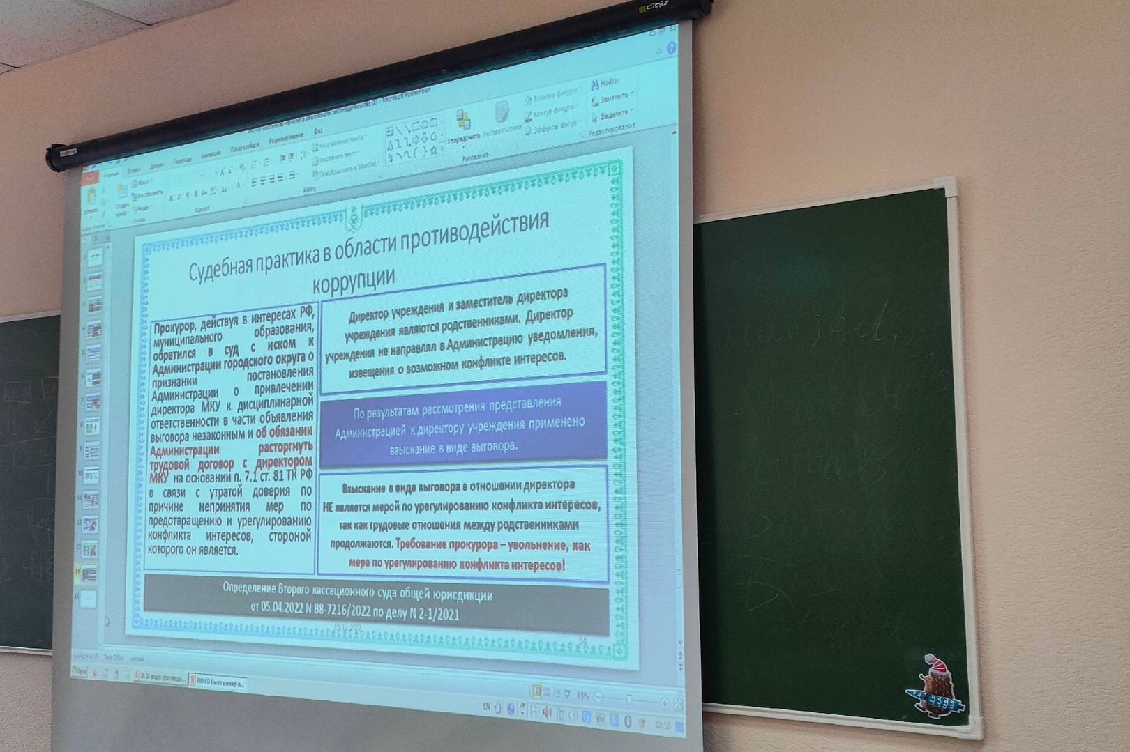 В ходе беседы были также освещены темы государственной политики в области противодействия коррупции; судебная практика по применению антикоррупционного законодательства; рассмотрены понятия «личная заинтересованность», «конфликт интересов», «должностные лица», «взятка», «вымогательство взятки» и др.