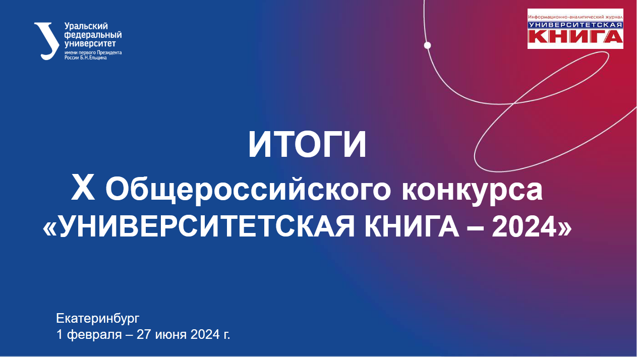 27 июня в Уральском федеральном университете имени первого Президента России Б.Н. Ельцина состоялась церемония награждения победителей X Юбилейного общероссийского конкурса учебных и научных изданий для высшей школы «Университетская книга – 2024». Организаторами конкурса выступили журнал «Университетская книга» и Уральский федеральный университет.