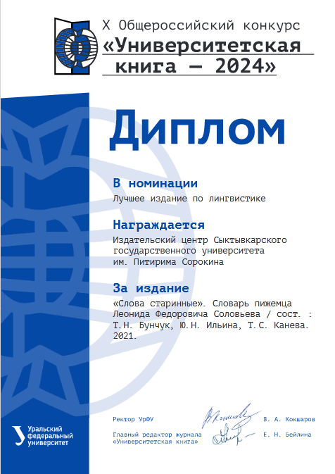В конкурсе приняли участие и издания СГУ им. Питирима Сорокина. В номинации «Лучшее издание по лингвистике» была отмечена дипломом победителя книга «Слова старинные». Словарь пижемца Леонида Федоровича Соловьева» (2021). Жюри высоко оценило труд Издательского центра Сыктывкарского университета и составителей словаря – кандидатов филологических наук, доцентов кафедры русской филологии и внештатных научных сотрудников НИЛ «Филологические исследования духовной культуры Севера» Татьяны Николаевны Бунчук, Юлии Николаевны Ильиной и Татьяны Степановны Каневой.
