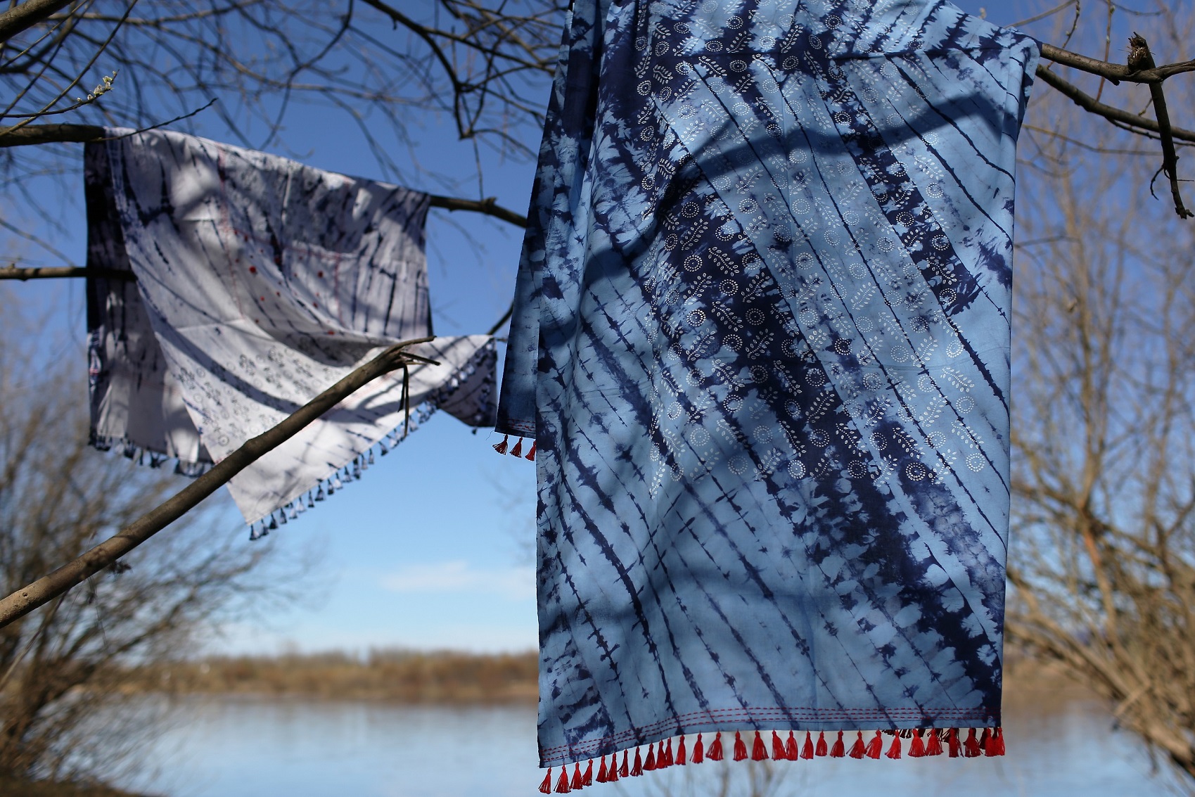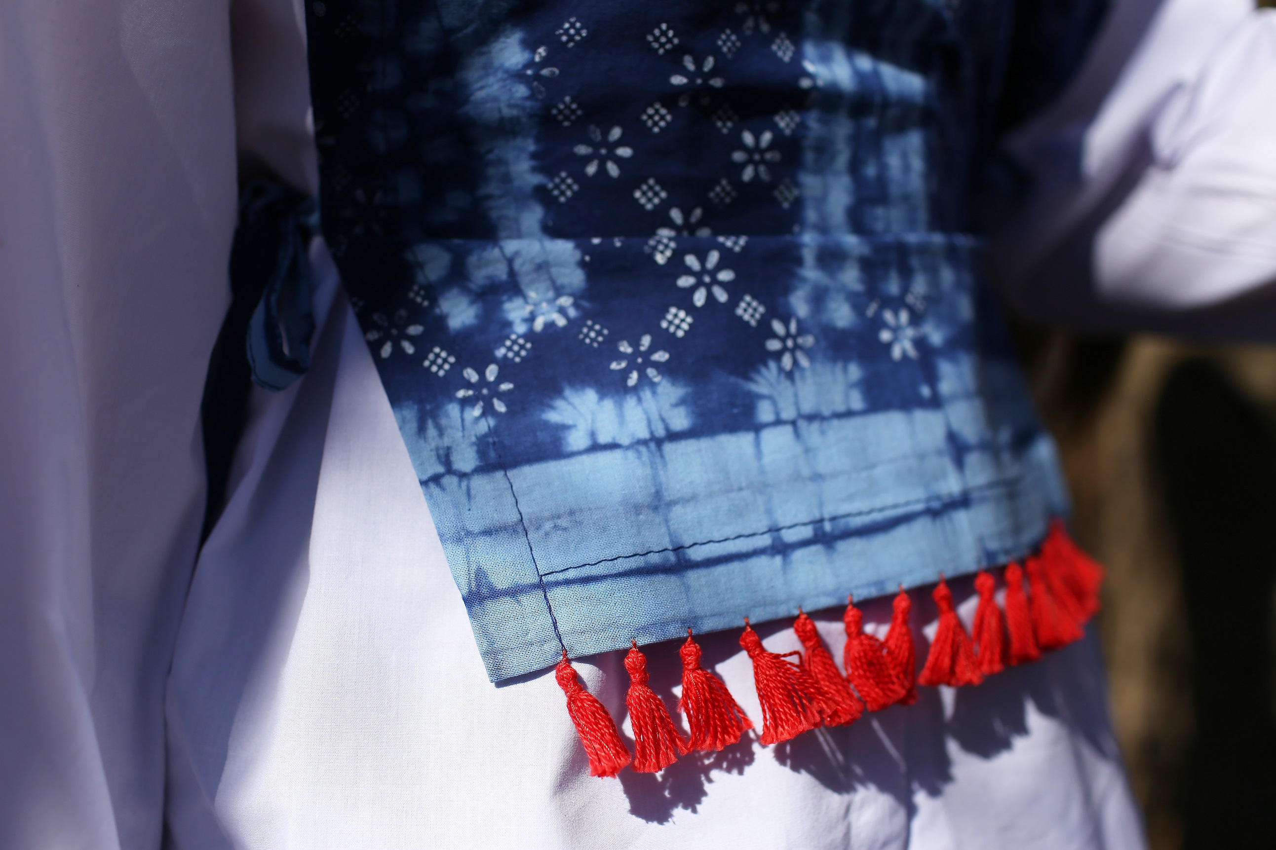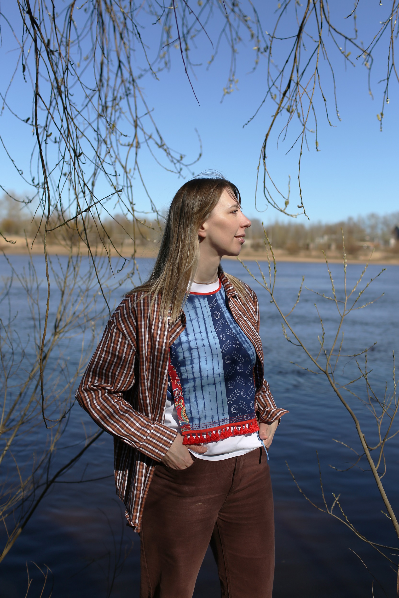 – Использовала синтез двух техник: крашение и нанесение набойки. Прежде всего, ткань нужно было заложить, прошить и смять особым образом. Затем нанести набойку. Из прокрашенной ткани отшивала изделия, которые вручную декорировала. Только после этого к жилету опять же вручную пришивала нарядные кисточки. Традиционная мода – это многодельная работа.