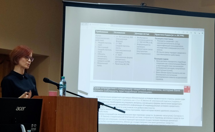 Важный вклад в рассмотрение проблемы внесло и обстоятельное сообщение Ольги Кодочиговой, также представителя ПАО «МТС», о формах правовой защиты при заключении договора в результате мошеннических действий, аргументированное примерами из судебной практики, где оператор связи выступал третьим лицом, о тенденциях в судебной практике (правовых позициях судов) по данному вопросу.