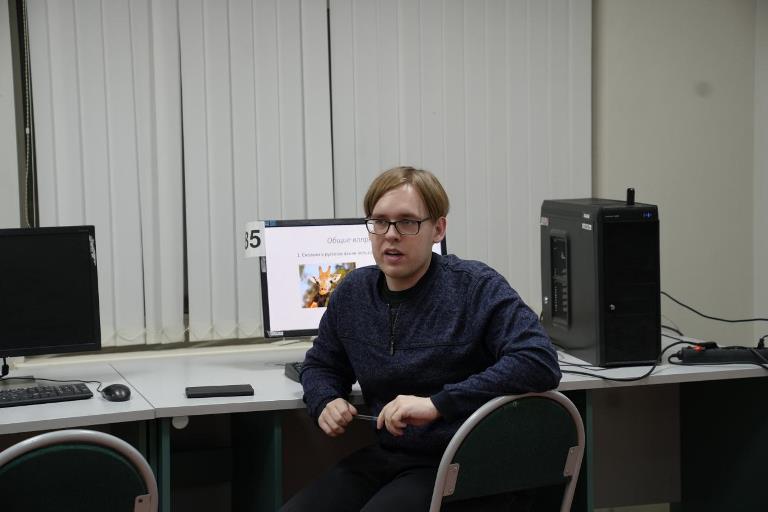 Дмитрий Бральнин, преподаватель кафедры русской филологии Института гуманитарных наук, провел мастер-класс, посвящённый истории и современности русского языка.