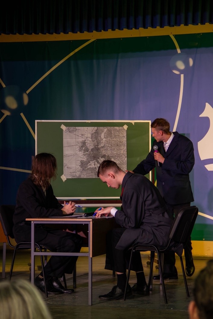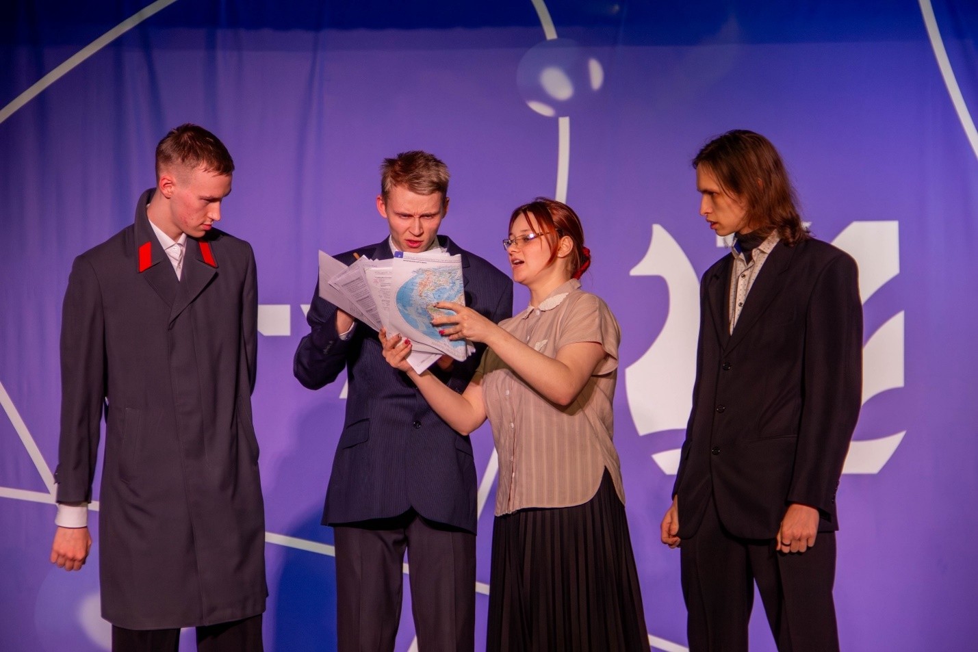 Во втором раунде участники разыграли небольшие постановки, где наряду с лидерами стран выступали и вымышленные персонажи – простые люди того времени. Наша команда с опорой на исторические источники и научную литературу поставило сценку об обсуждении послевоенного мира в кабинете Уинстона Черчилля. Выступление было наполнено экспрессией и ярким характером персонажей. Поддержку команде оказал Центр художественного творчества университета.