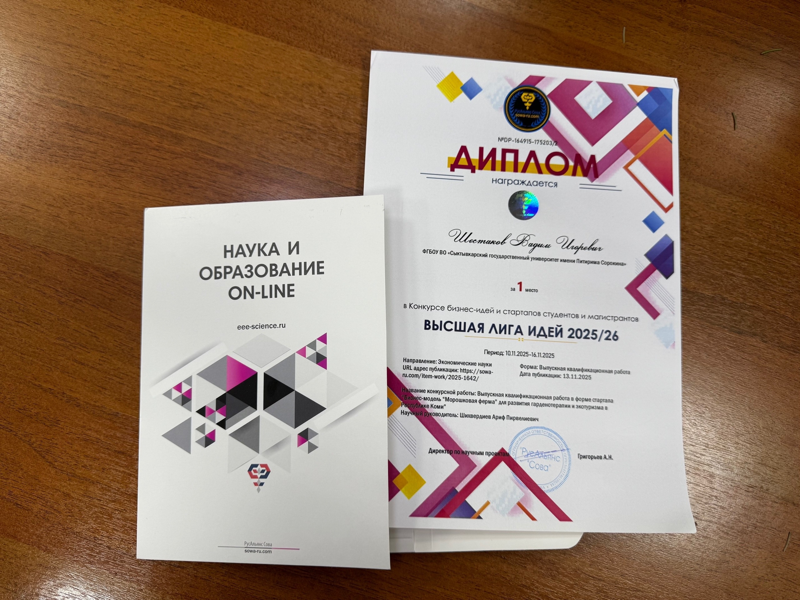 Конкурс «Высшая лига идей» ориентирован на студентов и магистрантов высших учебных заведений, которые стремятся развивать свои предпринимательские навыки и представлять инновационные бизнес-идеи. Выпускная квалификационная работа в форме стартапа «Бизнес-модель «Морошковая ферма» для развития гарденотерапии и экотуризма в Республике Коми», выполненная под руководством профессора Арифа Шихвердива, заняла первое место.