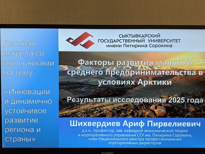 Темой встречи стали инновации и динамичное развитие национальной экономики. Профессор Ариф Шихвердиев рассказал школьникам о научных исследованиях, проводимых в университете, в том числе под его руководством, по развитию арктического предпринимательства. Были рассмотрены внутренние и внешние факторы, влияющие на развитие предпринимательства в Арктике.