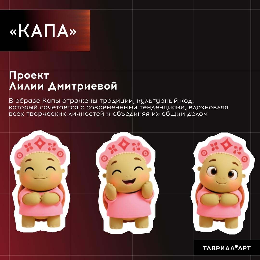 — Идея родилась сразу. Таврида у меня ассоциируется с морем, солнцем, горами, поэтому черепашка стала отражением морской тематики. Ну и, конечно, традиционные ценности и культурный код, который послужил основой концепции. Его я отразила в главном головном уборе для своего персонажа — кокошнике. В результате получился яркий, дружелюбный герой — черепашка Капа, — рассказала Лилия.