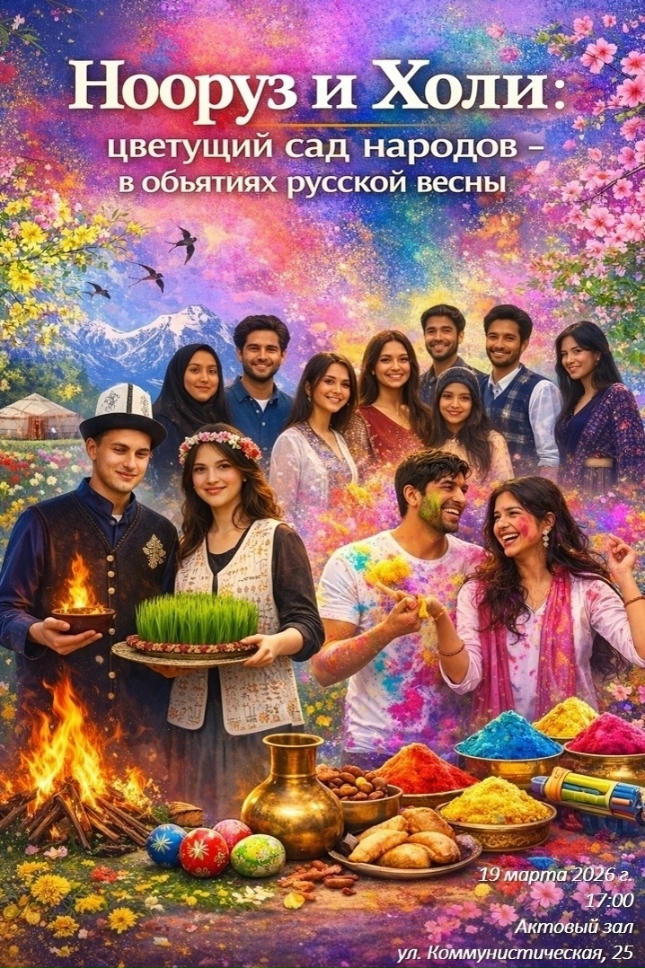 - Этно-презентация (16:30, холл корпуса Коммунистическая, 25): знакомство с традициями гостеприимства, дегустация аутентичных блюд (сумаляк, боорсоки и др.).