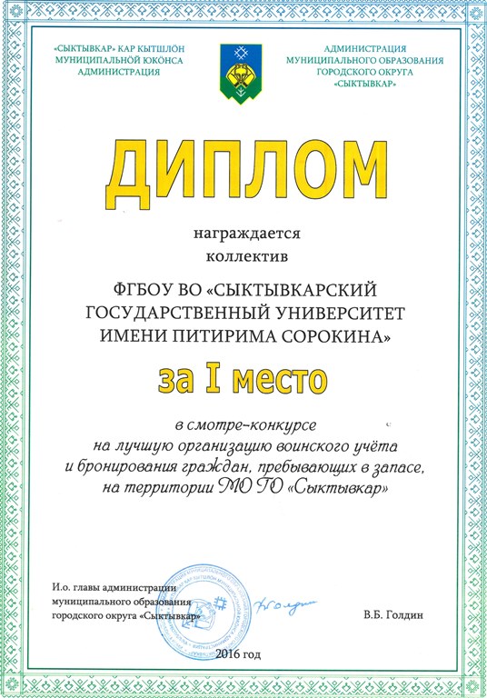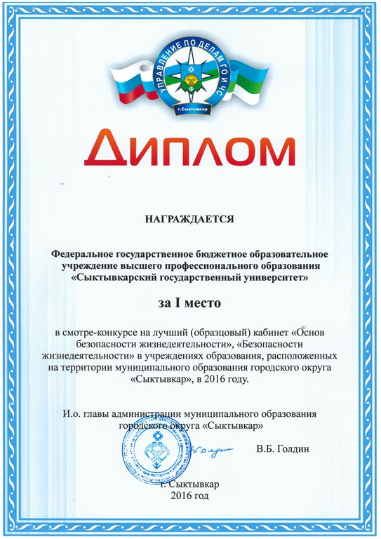 Второй диплом из рук Владимира Голдина представители вуза получили за победу в городском смотре-конкурсе на лучший (образцовый) кабинет «Основ безопасности жизнедеятельности». В конкурсе традиционно участвовали 3 вуза – СГУ им. Питирима Сорокина, Сыктывкарский лесной институт и Академия госслужбы и управления. Лучший в городе кабинет БЖД находится в учебном корпусе СГУ №8 по адресу ул. Коммунистическая, 25.