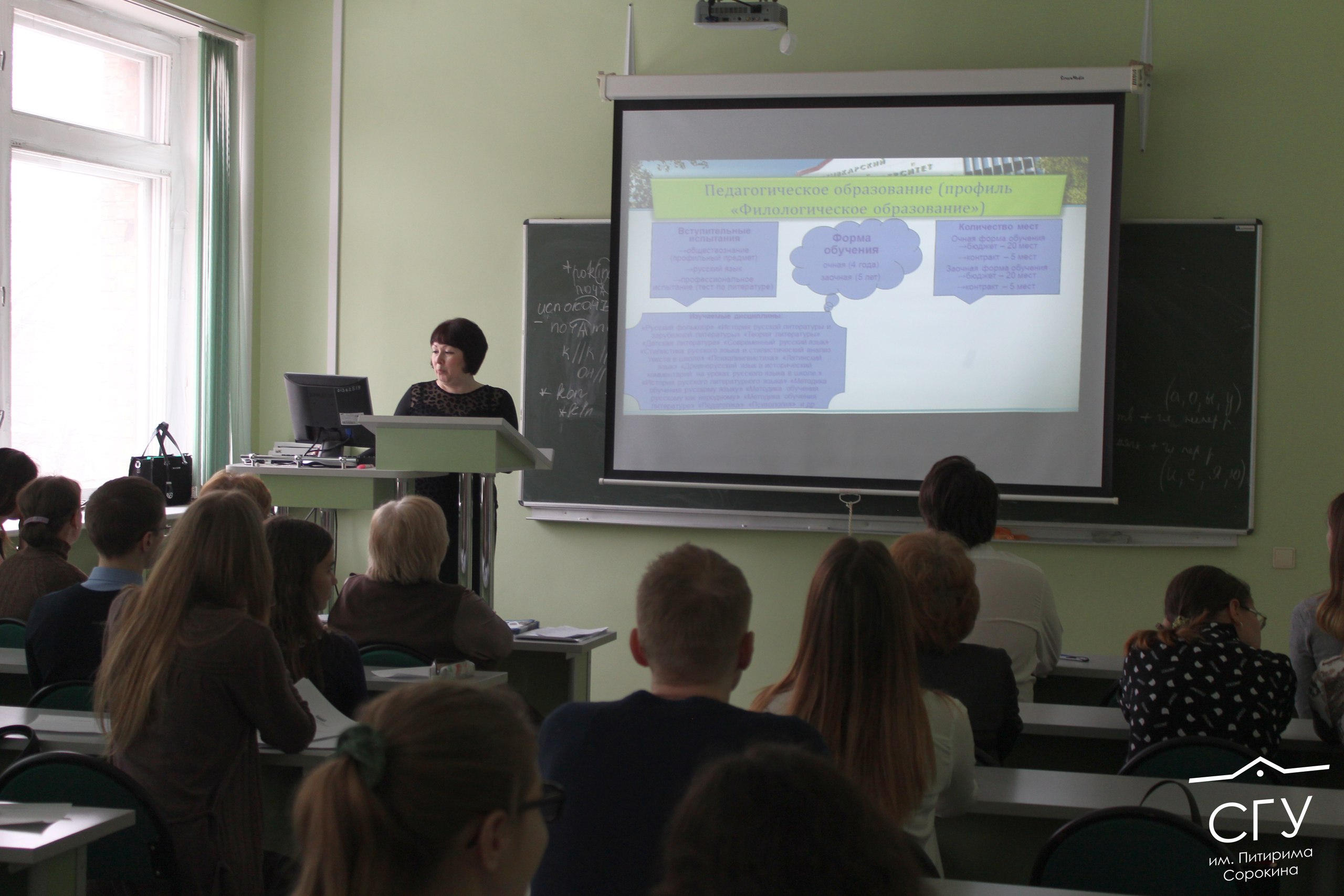 Директор рассказала абитуриентам о возможностях поступления в ИГН, направлениях и программах обучения, а также ответила на разнообразные вопросы. Вопрос о месте и роли коми языка в учебной программе университета стал темой небольшой дискуссии в аудитории. Вслед за директором Ольга Пыстина провела презентацию, в ходе которой более подробно представила каждое направление подготовки, уделив особое внимание вопросам будущей работы по специальности и описав открывающиеся возможности практики и самореализации.