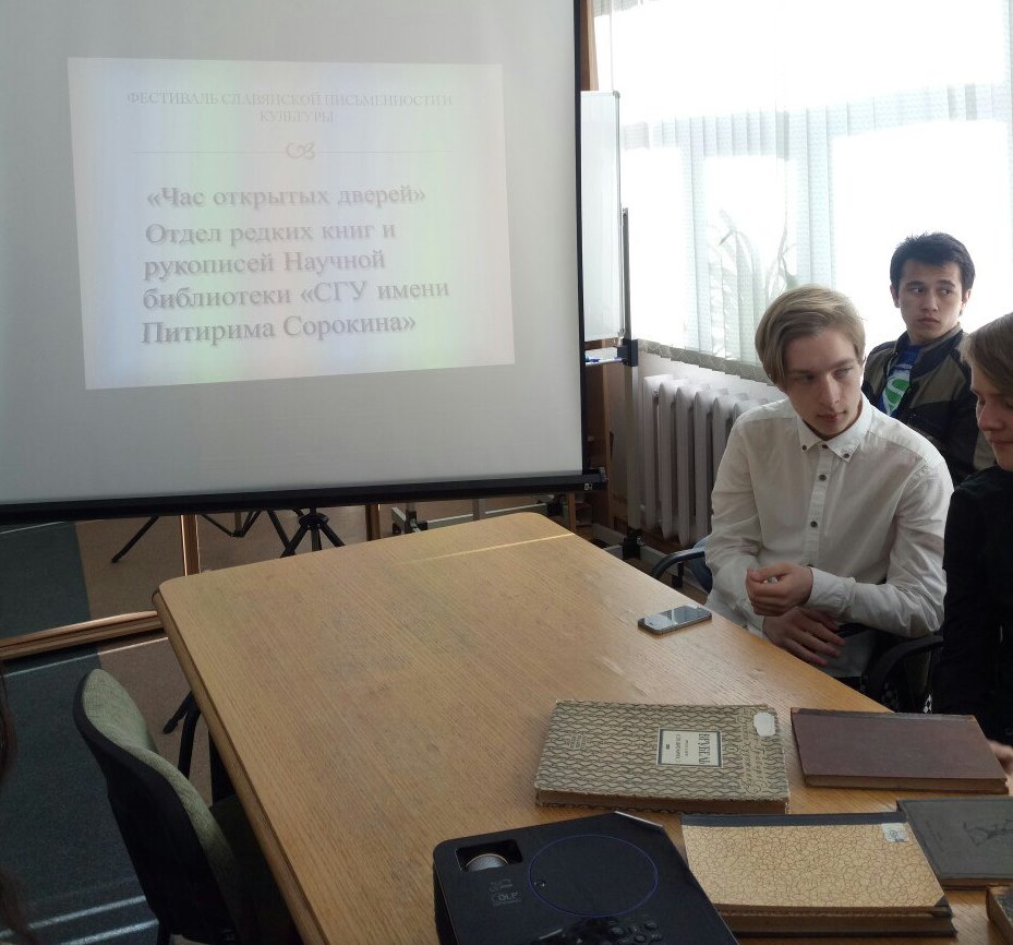 В рамках Фестиваля славянской письменности и культуры, 17 мая 2017 года студенты СГУ им. Питирима Сорокина и иностранные студенты ближнего зарубежья посетили «Час открытых дверей» в отделе редких книг и рукописей Научной библиотеки СГУ им. Питирима Сорокина.