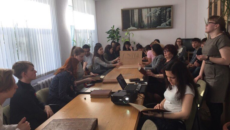 Прежде чем, взять эти памятники литературы в руки, исследователи надевают перчатки. Во время знакомства с редкими книгами студенты смогли полистать страницы книг, правда, только старопечатных: представляющие большую ценность рукописные тома демонстрировали посредством презентации. Познакомили студентов со старопечатной книгой с металлической застежкой, которая имеет хорошо сохранившийся переплет: доску, обтянутую кожей с тиснением. Все были удивлены практичности издателя: на нижней крышке переплета есть ножки, как нам пояснили, чтобы тиснение на переплете не стиралось.