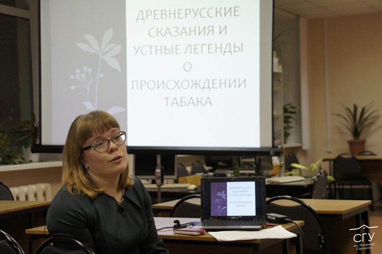 Вторую лекцию на тему «Древнерусские сказания и устные легенды о происхождении табака» подготовила аспирантка Института гуманитарных наук Татьяна Бровкина (научный руководитель – профессор Татьяна Волкова), рассказав об истории распространения табака в Европе, легендах и сказаниях, в которых говорится, почему нельзя употреблять табак.