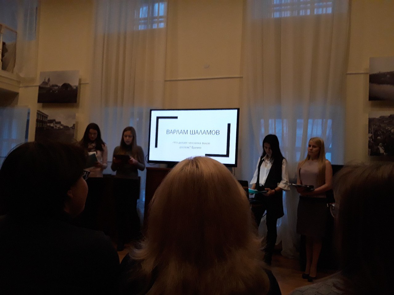 Слушателям было интересно узнать, что Варлам Шаламов вел активную жизнь в университете, а также писал стихотворения, часть из которых отправлял с Колымы Борису Пастернаку на вычитку. Спикеры представили отрывки из нескольких произведений Варлама Тихоновича, рассказали о сборнике «Колымские рассказы», состоящем из 6 книг и др. Кроме того, студентки упомянули различие взглядов Шаламова и Солженицына на ГУЛАГи и трудовые лагеря – Варлам Шаламов нашёл в своё время в рассказе «Один день Ивана Денисовича» несколько расхождений с реалиями жизни в лагере.
