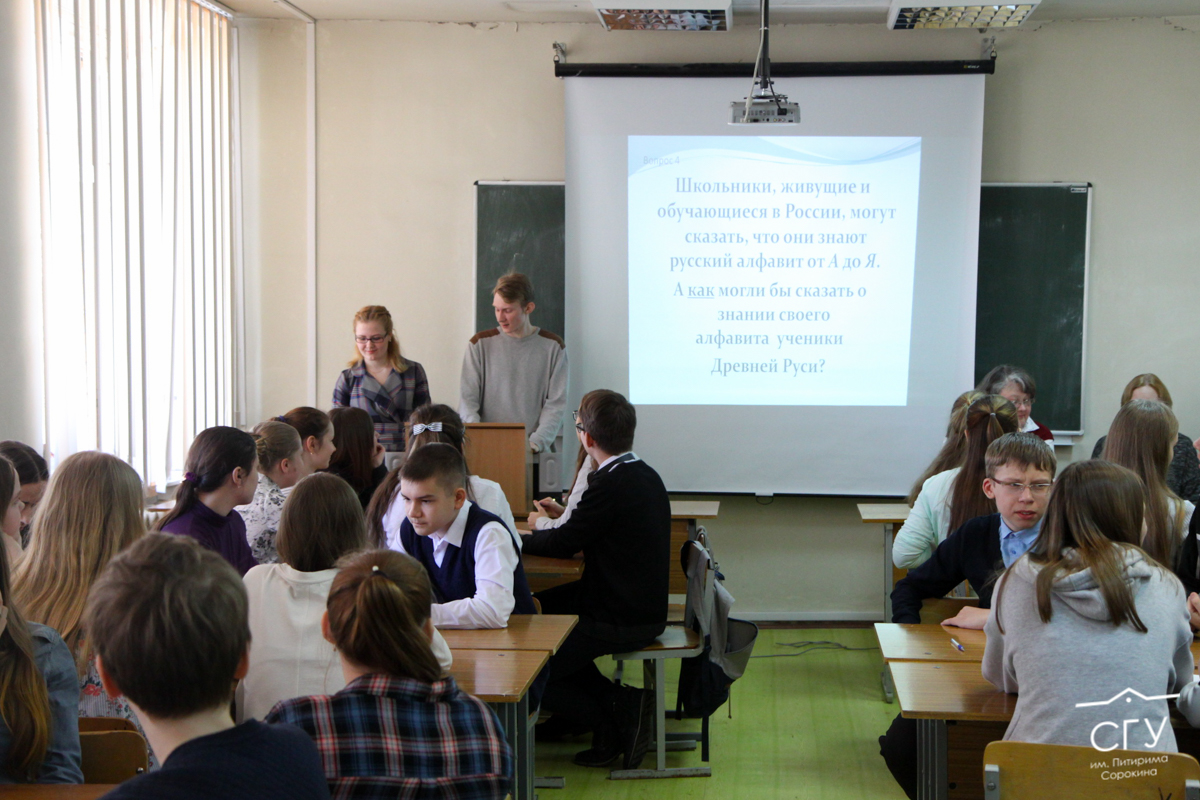 Игра прошла в два этапа, каждый из которых содержал 10 вопросов, связанных с русским языком и литературой. В первом этапе школьники отвечали на вопросы средней сложности, которые оценивались в один балл. Участникам давалась одна минута на размышление, после чего они писали ответ на бумаге и передавали жюри, в состав которого вошли преподаватели кафедры русской филологии СГУ им. Питирима Сорокина.