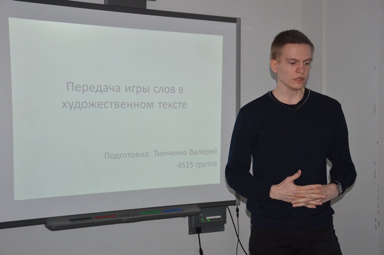Харизматичный Константин Попов и рассудительная Таисия Игнатьева (гр. 3585) предложили вниманию присутствовавших подробный критический анализ переводов названий продуктов масс-медиа. Умение работать с аудиторий и убеждать публику в собственной правоте, без сомнения, является сильной стороной Константина.