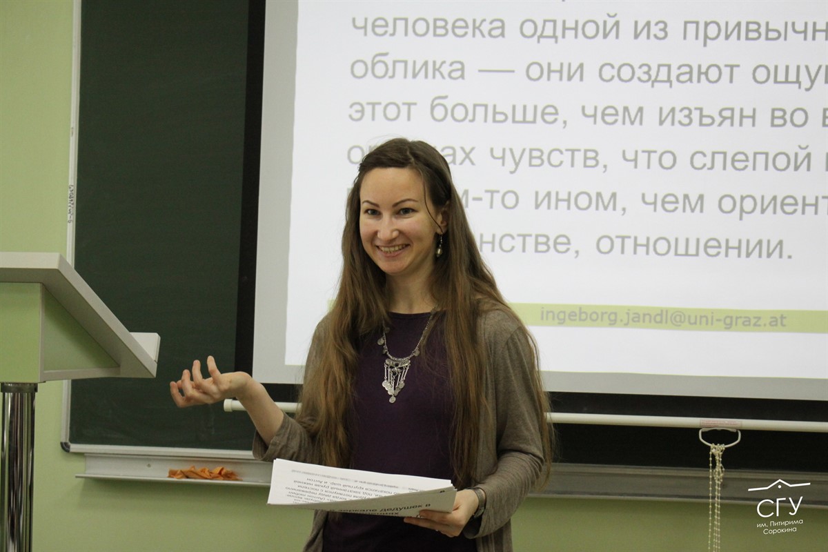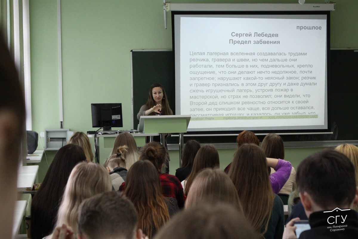 Ингеборг Яндль приехала из Австрии, чтобы рассказать студентам из Коми о произведениях современных российских писателей. Девушка преподает в Грацком университете имени Карла и Франца, занимается русской литературой XX и XXI веков. За последние годы она успела попутешествовать по российским городам с образовательными лекциями и выступлениями на конференциях. Встреча со студентами СГУ им. Питирима Сорокина состоялась 15 апреля.