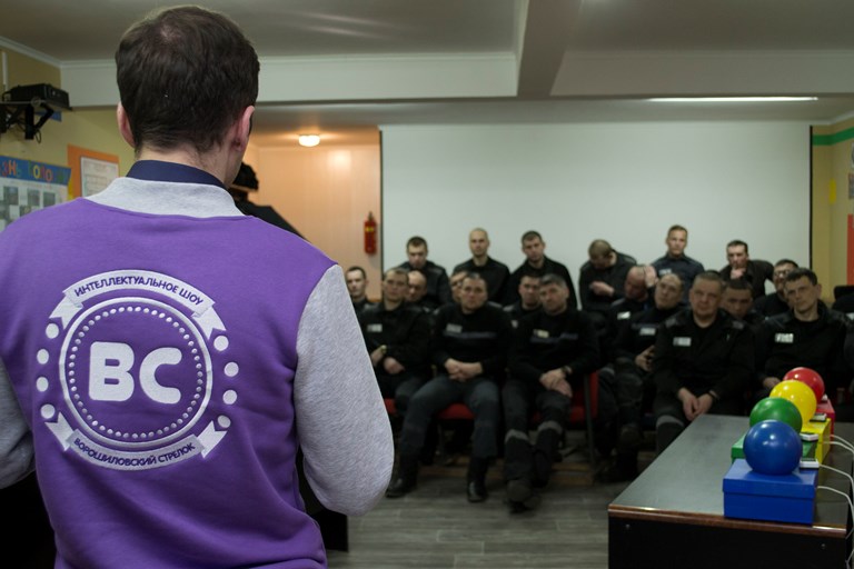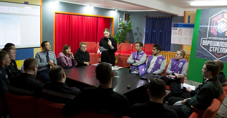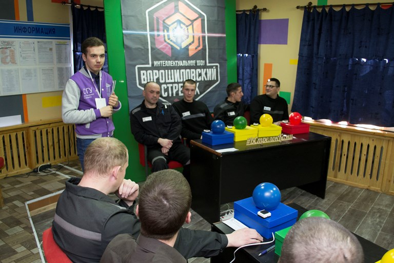 Встреча началась с «разминки для мозга». С собой в исправительную колонию активисты университета Дмитрий Воробьев, Михаил Редькин и Ройал Ширинов привезли специальные модули для игры «Ворошиловский стрелок». В нее сыграли восемь команд из числа осужденных по четыре человека в каждой.