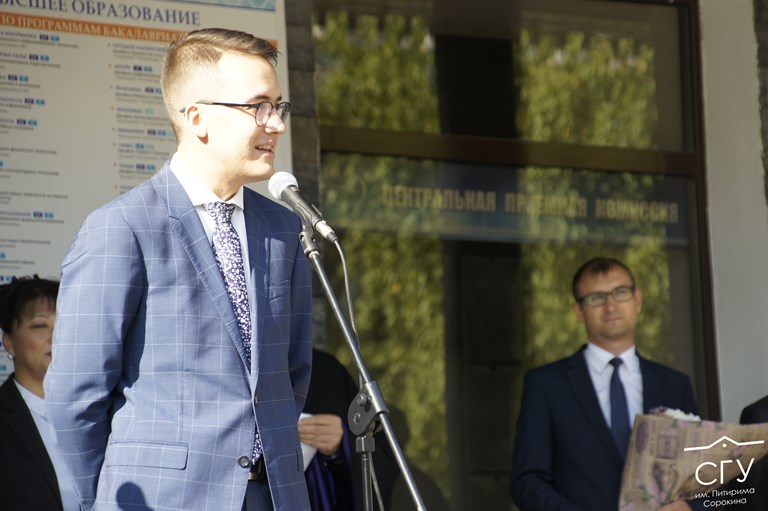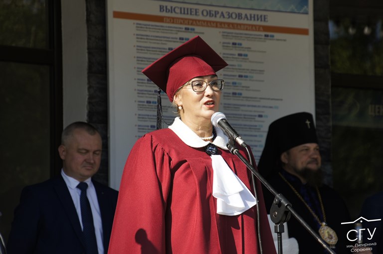 — Наступил торжественный день, когда вы получаете статус студента опорного вуза. Дорогие наши первокурсники, я желаю, чтобы этот старт познаний был для вас приятен. Желаю, чтобы удача всегда была на вашем пути. Живите ярко, живите красочно, творите добро и с честью несите звание студента СГУ им. Питирима Сорокина. Виват, первокурсники!
